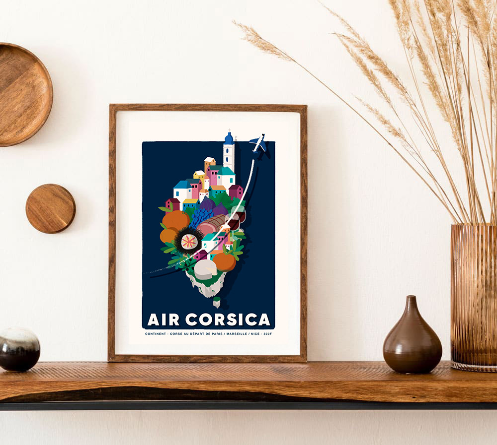 Illustration of a vintage Air Corsica travel poster.